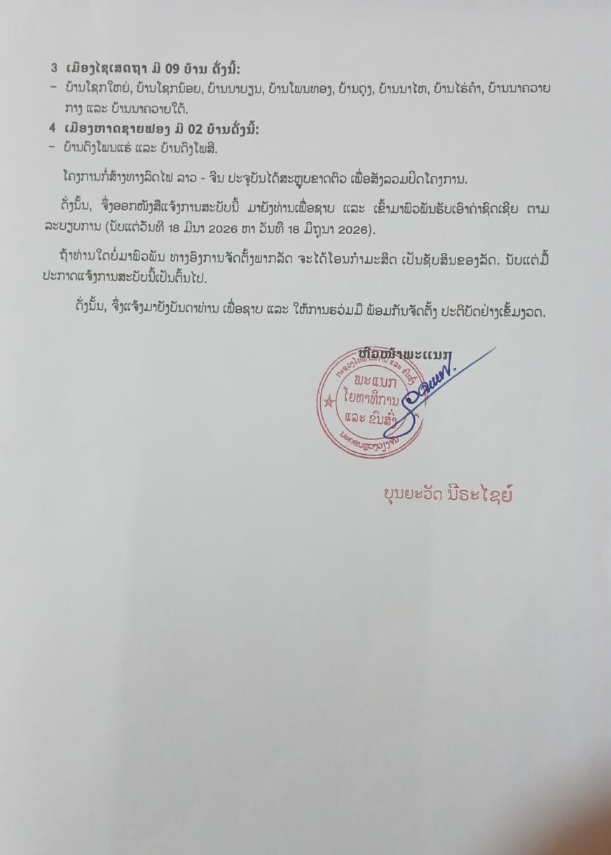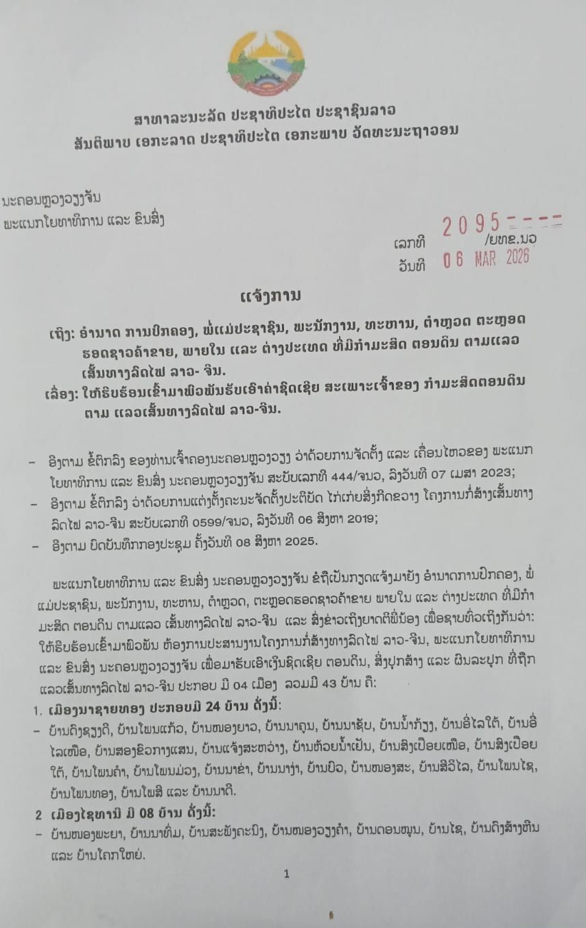 ແຈ້ງການເລກທີ່ 2095/ຍທຂ.ນວ ລົງວັນທີ 06 ມີນາ 2026 ກ່ຽວກັບການພົວພັນຮັບຄ່າຊົດເຊີຍສະເພາະເຈົ້າຂອງກໍາມະສິດຕອນດີນຕາມແລວເສັ້ນທາງລົດໄຟລາວ-ຈີນ.